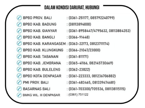 •  Nomor telepon Basarnas Bali: (0361) 703300/705536, 081138115115